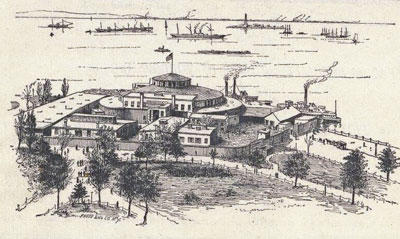 Ovan, Castle Garden med Battery Park på Manhattans sydspets.Bilden är från National Park Service.
