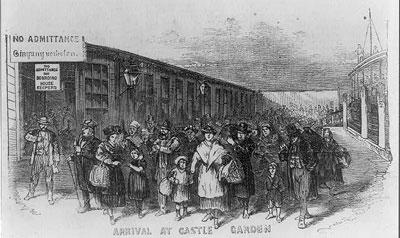 Ovan, Nyanlända immigranter till Castle Garden. Bilden är daterad 20 januari 1866. Bilden är från National Park Service.