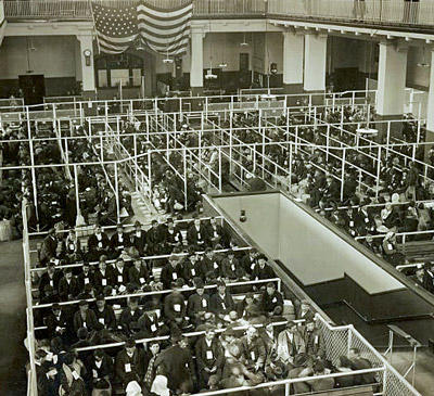 Ovan, Immigrantstationen Ellis Island omkring 1920. Fotot är från Library of Congress. Fri bild.