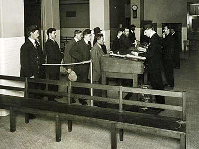 Ovan, Immigranter som väntar på sin tur för kontroll av immigrantinspektörena. (1902-1913). New York Public Library.