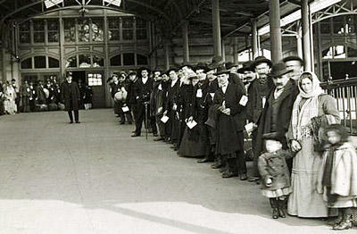 Ovan, Immigranter som fått inträde i USA och väntar på att få lämna Ellis Island (1902-1913). New York Public Library.
