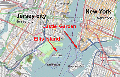 På ovanstående karta ser vi både Ellis Islands läge i Upper New York Bay samt Castle Garden på Manhattans sydspets.Snett upp till höger om Ellis Island ser vi mao Manhattan (New York City) och till vänster Jersey City. Ellis Island ligger faktiskt på Jersey-sidan om stadsgränsen mellan New Jersey och New York City. Söder om Ellis Island ligger Libery Island där Frihetsgudinnan står (Statue of Liberty).Bilden är en sk. fri bild utan upphovsrätt.
