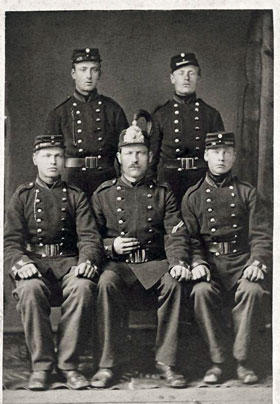 A proposal was put forward in the Swedish Parliament (Riksdag) in 1812 to resort to a universal conscription service for men called Beväringen or Beväringsinrättningen. The Swedish wars during the first decade of the 19th century had shown the great need of replacement soldiers for the regular standing army. Beväringen was to be a complement and reinforcement of the regular professional army. The act was adopted in the Parliament on October 27, 1812, and the conscription service was to be universal which meant that all able-bodied men fit for military service had to undergo a minimum military training in the armed forces. In 1820 the service time for the draftees was set to 12 days which had to be effected during the first year.For some reason, the hiring of substitutes was allowed, i.e. to pay someone to do the service in his place. This right to avoid conscription made it very unpopular since only wealthy had the possibility of doing so. In 1860 the possibility of hiring substitutes was replaced with a right to redeem conscription. Instead of hiring someone the eligible men paid a commutation fee directly to the Army. This right was abolished in 1872 and from then everyone called up had to do the military service.The conscripts only had to do 12 days of military service per year. However, the service time for conscripts was increased to 30 days (divided into two years) after the Crimean War (1853 - 1856) in the parliament meetings 1856-1858.In 1885 the age classes for conscription were increased from 5 to 12 years of which the last age classes (ages 27 – 32) were assigned to the newly established Landstormen (Veteran Reserve). The military service age was in other words extended 21 - 25 to 21 - 40 years of age. The service time was at the same time extended to 42 days divided into two years. In 1892 a new Army Act was adopted in the Parliament. The liability to conscript service was now increased to 12 years in the Beväringen and 8 years in the Landstormen (in total 20 age classes) and the service time was increased to 90 days. The photo to the right shows soldiers in uniform m/1860 with cap m/1865, most likely Jönköping Regiment (Infantry). The image is published with the consent of Anders Thorstensson.The only legal possibility the authorities in Sweden had to prevent emigration was the general prohibition for conscripts to emigrate to other countries without permission. It is considered to be a connection between avoidance of conscription and emigration. Every time the military service time for conscripts was extended the number of emigrated 20-years old men increased, at least temporarily. It wasn’t that difficult to obtain permission to leave the country though. During the second half of the 1800’s the authorities were generally generous with the permissions. However, at the end of the 1800’s fulfillment of conscription was needed to get permission to emigrate. Without a such exit permit you couldn’t get a moving certificate from the parish minister and thereby not be able to buy an emigrant ticket through an emigrant agent. The Police Departments in the Swedish emigrant ports checked that the regulations were followed and that the emigrants were legal emigrants.The only possibility for eligible men to avoid conscription was illegal emigration. Normally they then went to Copenhagen in Denmark, Oslo or Trondheim in Norway and from there to the United States. It is however, not known how large this illegal emigration was.Between 1682 and 1901 Sweden had a standing professional Army organized within a system called the Allotment System (Indelningsverket). From 1812 to 1901 Sweden also used a conscript system alongside the standing army called Beväringen, as mentioned above. In 1901 both the standing professional army and the Beväringen was abandoned and Sweden instead introduced an army and navy entirely based on a Universal Conscription System called Allmän Värnplikt. In a way Beväringen was a forerunner to the National Service System.The draftees were according to the Universal Conscription Act to undergo a military training for 150 days followed by three compulsory military refresher courses of 30 days each between the second and the fourth year, in total 240 days. In 1914 it increased to 340 days.Every Swedish man was obliged to register for Universal Conscription the year they reached the age of 21. In 1914 the age was lowered to 20 years old. The first draftees received their calling up notice for the new Universal Conscription Service in the spring of 1902.The training of the soldiers in the Conscription System was now held over a longer period of time compared to Beväringen. Each year, a fixed number of new recruits were drafted for military training. When one set of recruits finished their training period a new set of recruits was drafted. Every able-bodied Swede between the ages of 18 (first 21, then 20, later 18 years old) and 30 were liable to do military service.The Swedish Conscription System was inactivated on July 1, 2010. The armed forces thereafter are now based on a system with enlisted soldiers and officers contracted for a specific time (contractual employment) or until further notice.