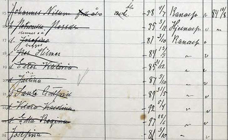 Ovan, familjen Johannes Nilsson, HFL 1891 (Förslöv):Bilden till vänster visar husförhörslängd för Förslöv AI:16 (1882-1891) Bild 53 / sid 257, Ranarp no 9. Här ser vi föräldrarna och deras barn med födelsedata. Till höger ser vi att Johannes återvänt från USA den 24 juli 1883. Vi ser även att paret gifte sig den 10 augusti 1884.