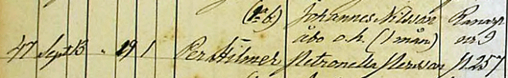 Ovan, ser vi Per Hilmer Johansson födelsenotis i födelseboken för Förslöv CI:6 (1860-1887) Bild 240. Han är född den 13 september 1884. Plats Ranarp no 9, Förslövs socken. Han är döpt den 19 september.I USA använde han namnet Peter H. Johnson även om han kallades Hilmer inom familjen.