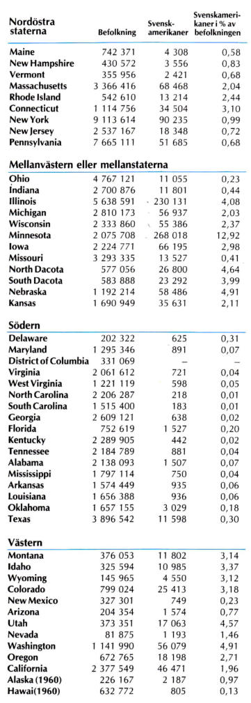 Tabellen visar svensk-amerikanarnas fördelning på region och delstater i USA år 1910.Andra kolumnen visar respektive delstats befolkningstal 1910 medan tredje kolumnen visar andelen svensk-amerikaner i delstaten detta år. Fjärde kolumnen visar svenskamerikanernas andel i procent av befolkningen i delstaten. Källa: United States Census Reports 1910/1960.Begreppet Svensk-amerikan i denna sammanställning är definierad som en USA immigrant född i Sverige eller en person född i USA som hade en eller båda föräldrarna födda i Sverige. Det betyder att det rör sig om de två första generationerna av svensk-amerikanare