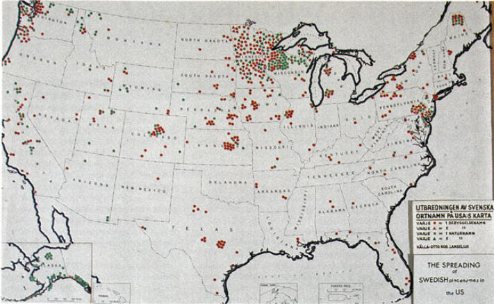Kartan ovan är från Otto R Landelius undersökning av svenska ortnamn i USA och visar utbredningen av de svenska ortnamnen. Emigrantinstitutet, Växjö.