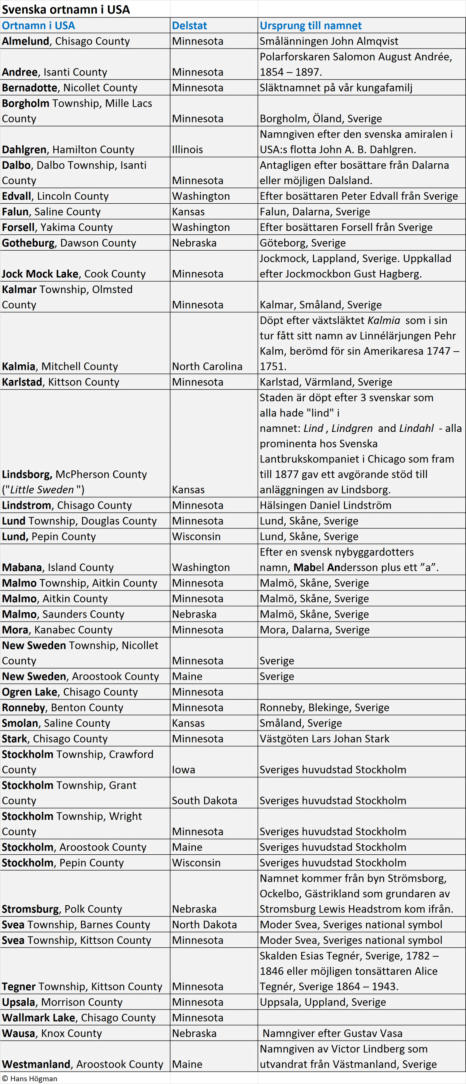 Svenskarna har gjort många avtryck i USA, inte minst vad avser ortnamn i svenskbygderna. Det finns många exempel på svensk-klingade ortnamn. Det kan vara ett namn som matchar en ort med samma namn i Sverige eller ett namn som har sitt ursprung i den person som grundade samhället. De allra flesta svenska ortnamnen finns i delstaten Minnesota men även i andra stater finns svenska ortnamn. Även delstaten Washington har ett 50-tal svenska ortnamn. Washington var det största sammanhängande svenska bosättningsområdet väster om Klippiga bergen.Svensken Otto R Landelius har gjort en undersökning om förekomsten av svenska ortnamn i USA. Han har identifierat cirka 800 ortnamn som har en svensk bakgrund. Mer än en fjärdedel av dessa ligger i Minnesota.Även om det svenska språket inte längre talas i de gamla svenskbygderna i USA så påminner ortnamnen fortfarande om vad som varit.Nedan följer några exempel på svenska ortnamn i USA som jag hittat: