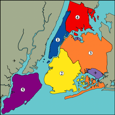 New York City Boroughs. 1=Manhattan, 2=Brooklyn, 3=Queens, 4=The Bronx, 5=Staten Island.På bilden visas även de 3 stora flygplatserna i New York omådet. LaGuardia Airport (LGA) ligger i norra Queens och Kennedy Airport (JFK) i södra Queens. Newark Airport (EWR) ligger på New Jersey sidan, väster om Hudson River.Bilden är en sk. fri bild utan upphovsrätt.