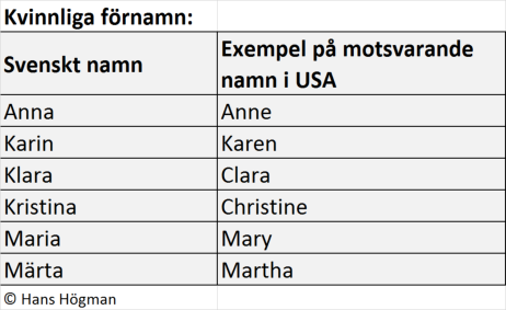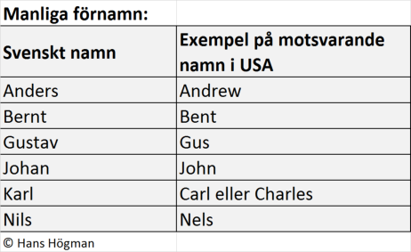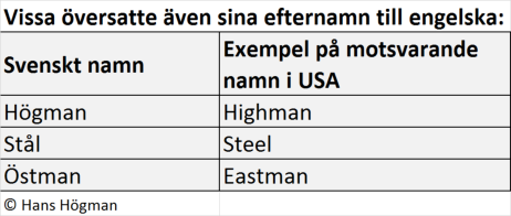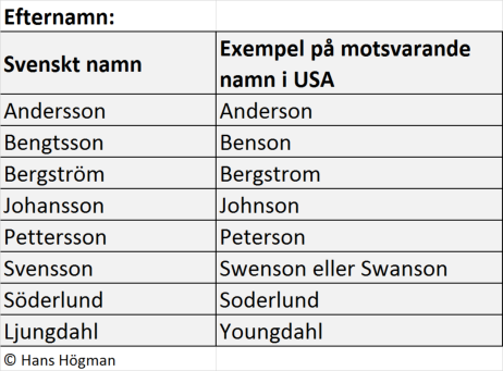 Under den stora svenska emigrationsperioden till USA, dvs mellan 1850 och 1930, krävdes inget speciellt för att byta sitt namn mot ett annat som lät mer amerikanskt. Man bara tog ett namn och började använda det.Det finns dock ett undantag vad gäller användandet av namn och det har med ansökan av amerikanskt medborgarskap att göra. Det namn som immigranten hade när han passerade immigrationskontrollen, dvs det namn som stod på manifestet, var det namn som man måste använda när man skickade in sin ansökan Declaration of Intention och Petition for Naturalization. Detta var det namn som myndigheterna använde för att kontrollera när man anlänt till USA och vem man var. I övrigt brydde sig inte myndigheterna om vilket namn man använde.På manifesten ser man ofta ett handskrivet nummer i första kolumnen, ett nummer som har skrivits långt efter immigrationen. Detta nummer är det nummer som tilldelades ansökan av Declaration of Intention.Amerikanska medborgare behövde inga pass vid utlandsresa förrän 1941. När en sk. naturalized citizen(immigrant som fått amerikanskt medborgarskap) ansökte om pass användes Certificate of Citizenship(dvs beviset man fick när man fått medborgarskap) som bevis på medborgarskap och namnet på detta bevis var också det namn som hamnade i passet.