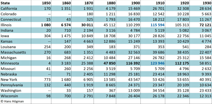 Ovan, Svenskfödda immigranter i USA fördelade på delstater. Som vi ser i tabellen är det i 1910-års census som vi har topparna med antalet svenskfödda i USA.Hans Högman. US Census är federala folkräkningar som görs vart 10:e år i USA. Census saknas dock för år 1890 då det materialet förstördes i en förödande brand år 1921. I USA har man gjort federala folkräkningar, U.S. Census, vart 10:e år sen 1790. Vissa stater har protesterat mot folkräkningarna eftersom de legat till grund för hur många representanter (Representatives ) respektive delstat kan skicka till House of Representatives i Washington, federala skatter mm. Dessa delstater har därför även gjort egna folkräkningar och då under andra år, vanligen med 5 års fördröjning. New York State är exempel på en sådan delstat som haft egna folkräkningar följande år: 1825, 1835, 1845, 1855, 1865, 1875, 1892, 1905, 1915 och 1925.Illinois var till en början den stat med flest svenska immigranter. Först i 1880 års census går Minnesota om Illinois och blir den främsta staten som svenskarna slog sig ned i, dvs de som kom under 1870-talet.Tabellen visar antalet svenskfödda vid respektive census, dvs personer som var födda i Sverige men emigrerat till USA.Som vi ser av tabellen ovan var det inte Minnesota utan framförallt Illinois som de tidiga utvandrarna slog sig ned i. Intressant är att i 1850-års census procentuellt sett finns många svenskar i Louisiana i den amerikanska södern. Siffran för Louisiana ökar dock obetydligt när de nordliga staterna får en kraftigt ökad invandring av svenskar.Nedanstående diagram visar totala antalet svenskfödda per 10-årsperiod, alla delstater. I 1910-års census fanns det flest svenskar i USA som var födda i Sverige, 675 560 st.