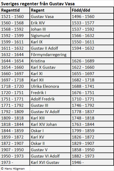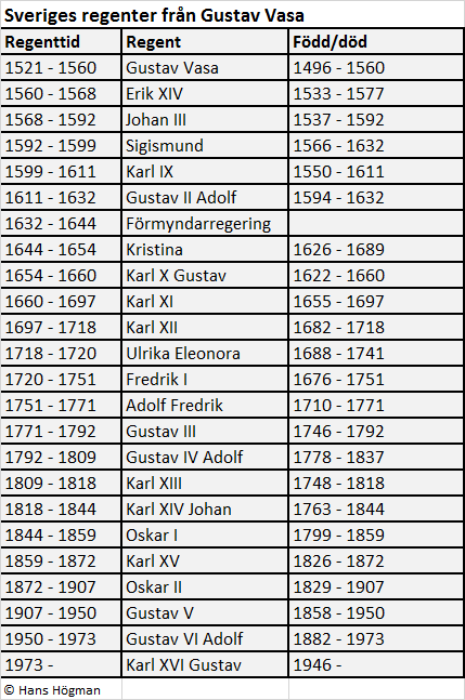 från kung Gustav Vasa och fram till dagens regent,