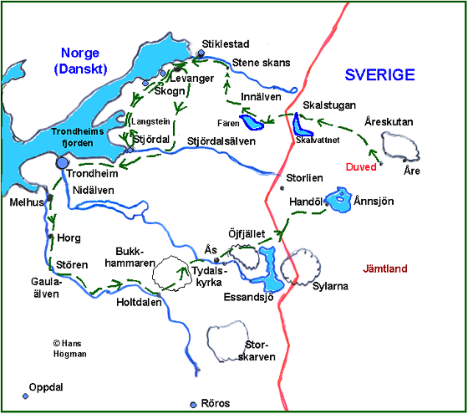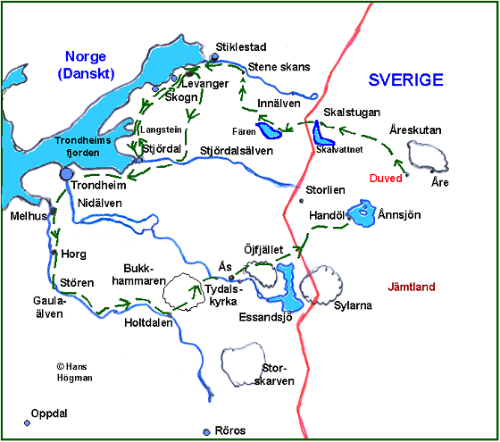 År 1718 var Karl XII redo för ett andra anfall mot det danska Norge. Noggranna förberedelser hade gjorts. Syftet var att tvinga Danmark till fred. Genom att ta Norge och därefter skeppa över de svenska trupperna till Nordtyskland och/eller Danmark skulle Sverige kunna att tvinga Danmark och Hannover till en för Sverige fördelaktig fred. Vidare skulle Sveriges situation i förhandlingarna med Ryssland vara betydligt starkare.I augusti är rustningarna klara och armén uppgår till 36.000 man. Karl XII leder själv huvudarmén som går in i södra Norge och General Carl Gustav Armfeldt leder den norra armén som anfaller in i Trondheims län från Jämtland. Bilden visar General Carl Gustaf Armfeldt (1666-1736). Bild: Nationalmuseum.Ett anfall på två fronter skulle splittra de dansk-norska styrkorna.Genom att sprida ut rykten att enheter ur den svenska norra armén, efter att Norge var intaget, skulle skeppas över till Skottland för att stödja ett uppror mot England och George I, skulle den engelska flottas bindas vid de egna kusterna och inte utgöra något hot när de svenska trupperna skulle skeppas över till Nordtyskland eller Danmark. Anledningen var att Hannover var nära knutet till England och ett angrepp på Hannover skulle innebära att England kom till hjälp.Fälttåget till Norge var inte populärt bland officerarna.Norge hade inget som lockade, där fanns inga rika krigsbyten att ta, ingen ära att vinna, få utsikter till nöjen vid pauser i kriget. Insatser i Norge skulle inte ge någon merit för officerare som ville göra karriär i Europa.Normalt skulle en armé i stort vara självförsörjande i fält under krigstågen vid denna tid. Man skulle leva av vad trakten kunde erbjuda och det var därför nödvändigt att ständigt flytta armén till nya trakter även om man inte var inblandade i stridigheter för tillfället. Denna princip att leva av vad landet hade att erbjuda bedömdes vara mycket svårt i Norge som mest bestod av ödsliga bergstrakter. I stället fick den svenska armén samla på sig stora mängder förråd vid gränsen och sen ordna med regelbundna provianttransporter till den framryckande armén. Det var oerhört viktigt att dessa transporter kom fram i tid. Bönder i större delen av landet engagerades i arbetet. I Strömstad, Västra Ed i Dalsland samt Holmedal och Eda i Värmland samlades förråd för 20.000 man och 6.000 hästar. I Duved samlades på motsvarande sätt förråd för 10.000 man och 3.000 hästar. Totalt skulle cirka 65.000 ton proviant och foder samlas in. Mellan oktober och december 1718 arbetade 15.000 bönder med 60.000 hästar dagligen med arméns transporter. Sex veckors mat åt ett enda regemente krävde 180 fyrspända vagnar. Då invasionen startade hade varje regemente med sig proviant för två veckor, därefter skulle försörjningen från förråden fungera. I södra Norge kom också de första transporterna fram efter 15 dagar.Bilden visar en skiss över Duved skans. Skansen byggdes om och förbättrades år 1710. Krigsrådet Johan Henrik Frisenheim (ca: 1670 - 1737) organiserade arméns underhåll härifrån under fälttåget i Tröndelag.