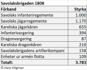 Det stridsreglemente som användes under de krig Sverige var inblandade under 1800-talets början var 1775-års reglemente. I avsnittet nedan benämns soldaterna i den svenska armén som svenskar oberoende av var de är födda, exempelvis i den finska delen av det svenska riket. På samma sätt kallas armén i Finland för den svenska armén eller den svenska armén i Finland. Naturligtvis var så gott som alla soldater som var roterade i de regementen som var uppsatta i Finland också födda där.Den 21 februari 1808, mitt i den kalla vintern, går kejsar Alexanders ryska trupper över den svensk-ryska gränsen in i Finland. Klockan 6 på morgonen hörs den första skottväxlingen vid Abborfors. De ryska styrkorna går över gränsen vid Keltis, Anjala, Hirvikoski och Strömfors. Endast i Anjala möter de något större motstånd och fördröjs några timmar. De formar sig på två fronter, en sydlig kustnära och en som går mot Savolaks.Efter ett dygn var den sydliga ryska kolonnen framme vid Lovisa och två dagar senare i Borgå. Den ryska huvudstyrkan som kom efter de första trupperna gick över gränsen vid Abborfors. Totalt uppgår den ryska anfallsstyrkan till 24.000 man. Man hade dock via diplomatiska kanaler starkt överdrivit storleken. Sverige trodde sig ha en armé på cirka 60.000 man mot sig. Överbefälhavare i den ryska armén var general Friedrich Wilhelm von Buxhövden.Anledningen till att ryssarna gick till anfall mitt i vintern var att det då var lättare att marschera fram på alla de tillfrysta sjöarna. Vidare kunde inte de svenska och brittiska flottorna ställa till problem på vintern samt att Sverige inte skulle kunna bistå armén i Finland med överskeppningar av soldater.