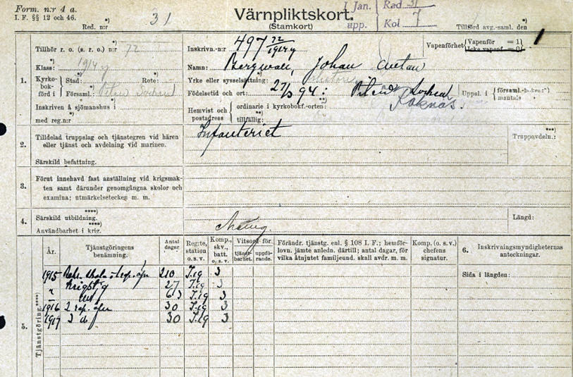 Ovan, sida 1 av ett stamkort/värnpliktskort för en värnpliktig vid infanteriet (se sektion 2 i stamkortet ovan). Den värnpliktiges namn är Johan Anton Bergwall, född 1894, och mönstrades år 1914 (sektion 1 ovan). Hans inskrivningsnummer är 497 72/1914. Bergwall skrevs in vid Piteå rullföringsområde (72) som då tillhörde Norrbottens inskrivningsområde.Sektion 5 i kortet ovan innehåller information om den värnpliktiges tjänstgöringar; år, tjänstgöringens benämning och antal dagar.Bergwall gjorde sin värnplikt vid Norrbottens regemente (I19) . I sektion 5 i kortet ovan finns en kolumn märkt “Reg:t, station osv”. Denna kolumn innehåller förbandsnumret för det förband som värnpliktstjänstgöringen gjordes vid. I detta fall I19, som är det förbandsnummer som Norrbotten regemente använder och regementet finns i Boden. "I" står för "infanteriet" I19 betyder det 19:e infanteri regementet.Mer information om förbandnumren finns på sidan: Förbandsnummer.Vidare, Bergwall tillhörde 3:e kompaniet vilket framgår av kolumnen "Komp., skv., batt. osv". Siffran “3” står för 3:e kompaniet.Uppe till vänster på kortet står “Tillhör r.o. (s.r.o) “ vilket syftar på vilket rullföringsområde den värnpliktige tillhörde, i detta fall 72 vilket även framgår av hans värnpliktsnummer. Så, r.o. betyder rullföringsområde och s.r.o. sjörullföringsområde.Källa: Norrbottens inskrivningsområde (Io 19), Piteå rullföringsområde (Ro 72) D4:3 (1914-1922) Bild 7770 (AID: v806614a.b7770, NAD: SE/KrA/0473/B19002Ö).
