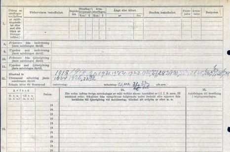 Ovan, sida 2 av ovanstående stamkort.Sektion 7 i kortet ovan innehåller information om eventuella förbrytelser och straff som den värnpliktige ådragit sig i tjänsten. Denna värnpliktige har inga anteckningar i dessa fält. Sektion 12 har information om den värnpliktiges mönstringar.Källa: Norrbottens inskrivningsområde (Io 19), Piteå rullföringsområde (Ro 72) (BD) D4:3 (1914-1922) bild 7780 (AID: v806614a.b7780, NAD: SE/KrA/0473/B19002Ö).