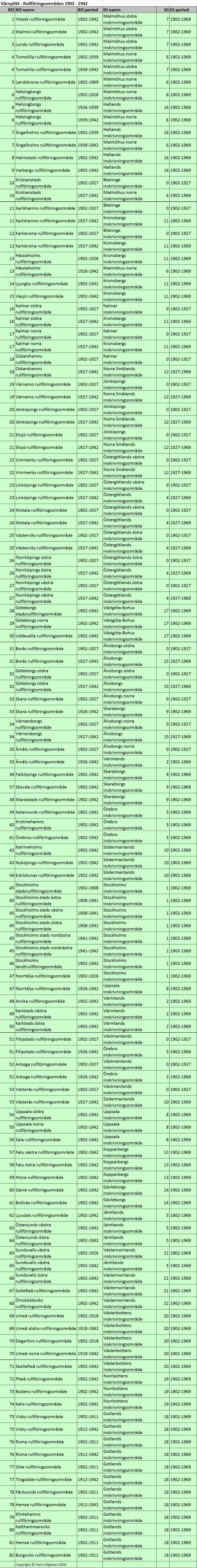 Mellan åren 1902 och 1942 skrevs de militära inskrivningsnumren för värnpliktiga på formen LLL RRR/ÅÅ, där LLL är individens löpnummer i rullan, RRR är rullföringsområdet och ÅÅ det år inskrivningen av individen skedde. För mer information om inskrivningsnumren, se under Inledning .I tabellen nedan visas följande information i de olika kolumnerna:•RO = rullföringsområdesnummer•RO namn = namnet på rullföringsområdet•RO period = den tidsperiod som rullföringsområdet tillhörde ett visst inskrivningsområde•IO namn = namnet på inskrivningsområdet som ett rullföringsområde tillhörde•IO = numret på inskrivningsområdet•IO period = den tidsperiod som inskrivningsområdet användesVissa inskrivningsområden upphörde 1927 och de har inga inskrivningsområdes nummer (i tabellen nedan har samtliga dessa områden IO nummer noll (0)).Exempel: Exempel: om vi har ett inskrivningsnummer 137 6/08 så ser vi att denna värnpliktig skrevs in vid Helsingborgs rullföringsområde (6) som 1908 (08) tillhörde Malmöhus norra inskrivningsområde. Med andra ord, använd siffrorna för rullföringsområdet (RRR) i inskrivningsnumret, i detta exempel 6, och gå in i tabellen nedan och leta upp värdet 6 i kolumnen märkt "RO" (första kolumnen) för att få fram rullföringsområdesnamnet samt namnet på inskrivningsområdet.Med hjälp av inskrivningsområdet kan man sen ta reda på vilket regemente som den värnpliktige tjänstgjorde vid genom att titta på vilka regementen som fanns inom området. Ytterligare information kan man få genom att söka den värnpliktige i inskrivningslängden för rullföringsområdet för året i fråga. Därefter kan man söka honom i de individuella stamkorten/värnpliktskorten. Se exempel på hur man söker efter Värnpliktiga i Allmänna värnplikten 1902 - 1942.