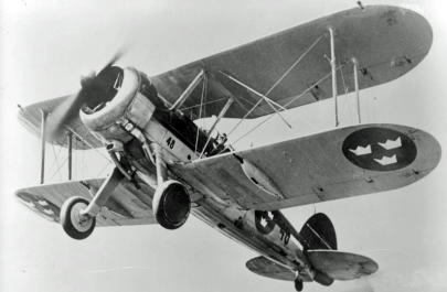Jaktflygplanet Gloster Gladiator J 8 märkt 48 i luften. Bild: Flygvapenmuseum, ID: FVMF.002090. Jaktfygplan Gloster Gladiator J 8, närmaste är nr 278, märkt F 10 - 23. Här på plats på Bulltofta. Foto: Mikael Forslund. Bild: Flygvapenmuseum En svensk Gloster Gladiator vid F 19, Svenska frivilligkåren i Finland 1940, med finska flygvapnets symbol (ett blått hakkors på vit bakgrund) målat på sidan. Foto: Karl Johan Åke Sundström. Bild: Flygvapenmuseum.Den finska svastikan har ingenting med nazism att göra. Finska flygvapnet använde denna symbol fram från 1918 och till andra världskrigets slut.  Interiör av förarplatsen i en Gloster Gladiator J 8. Bild: Wikipedia.