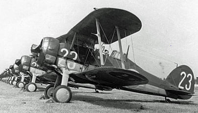Jaktfygplan Gloster Gladiator J 8, närmaste är nr 278, märkt F 10 - 23. Här på plats på Bulltofta. Foto: Mikael Forslund. Bild: Flygvapenmuseum