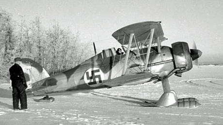En svensk Gloster Gladiator vid F 19, Svenska frivilligkåren i Finland 1940, med finska flygvapnets symbol (ett blått hakkors på vit bakgrund) målat på sidan. Foto: Karl Johan Åke Sundström. Bild: Flygvapenmuseum. Den finska svastikan har ingenting med nazism att göra. Finska flygvapnet använde denna symbol fram från 1918 och till andra världskrigets slut.